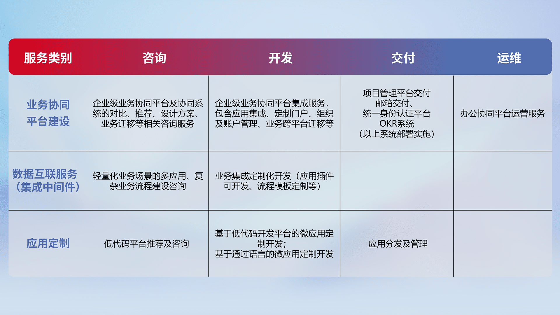 基于全代码低代码的数字化应用系统开发及交付,,,,满足特定业务场景的应用开发及集成,,提升企业业务信息化及数字化能力。。